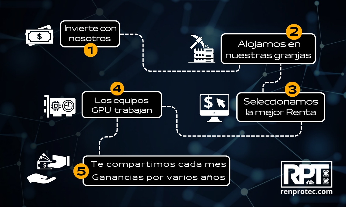 El poder de cómputo para entrenamiento de Inteligencia Artificial, la generación de imágenes y videos para IA, renders de video de cine, producción de minería para Bitcoin y otros Criptoactivos, ¡todo lo que requiere un amplio poder de procesamiento!, para muchas empresas es más redituable rentar el poder a terceros, que adquirir dispositivos y para eso existen plataformas de Renta, nosotros aprovechamos y creamos granjas de procesamiento tecnológico para ofrecer junto a nuestros inversionistas, nuestros equipos en renta